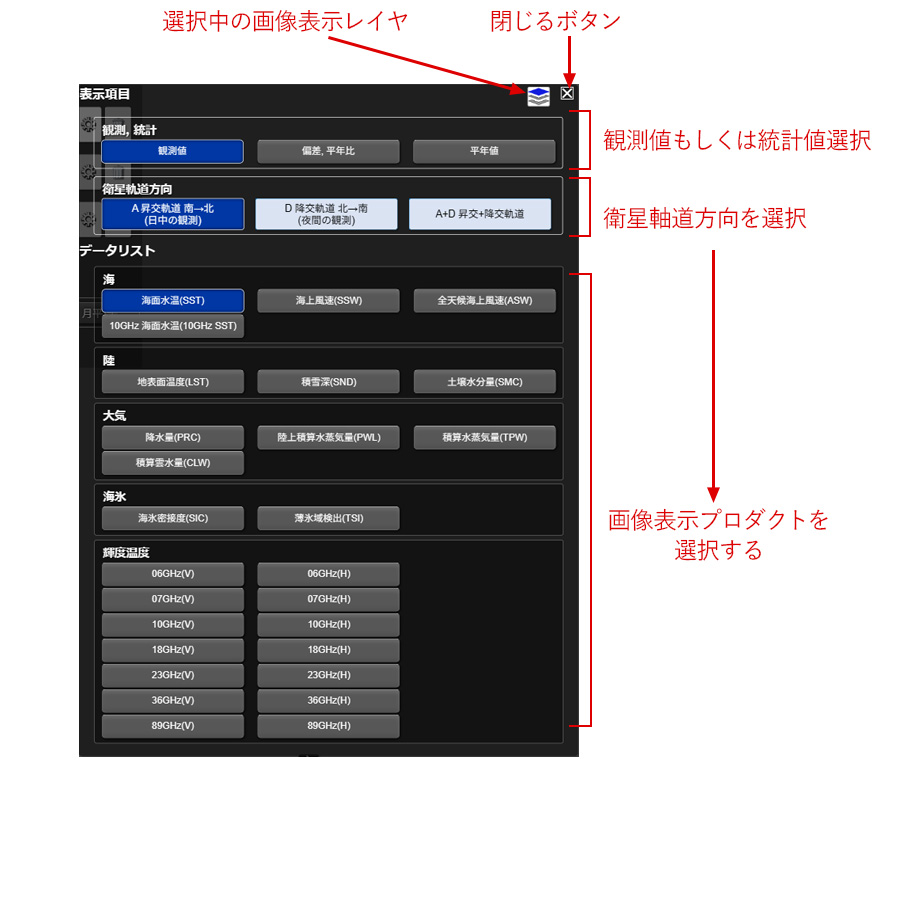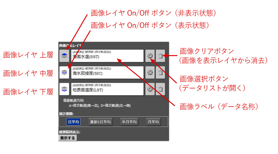 各レイヤの画像の種類を変更するためには、画像ラベルの右側にある選択ボタンを押してください。データリストのメニューが開きます。まず、観測値か統計値かを選択します。その後、衛星軌道方向(A)、(D)もしくは(A+D)を選択してから、次にデータを選択してください。マップに表示されている画像が変わります。 また、画像レイヤ下部の日平均、最新5日平均、半月平均、月平均を押すことで統計期間を変更することができます。